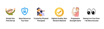 Attaching the handles to The DoorGym provides the perfect assistance for strengthening large muscle groups like your core, back, glutes, and quadriceps, while the bands have a resistance range of 2.5 - 40 lbs and are great for training smaller muscle groups like your chest, shoulders, rotator cuff and arms. Easily alternating between bodyweight and resistance band exercises makes The DoorGym is your all in one strength training solution.
