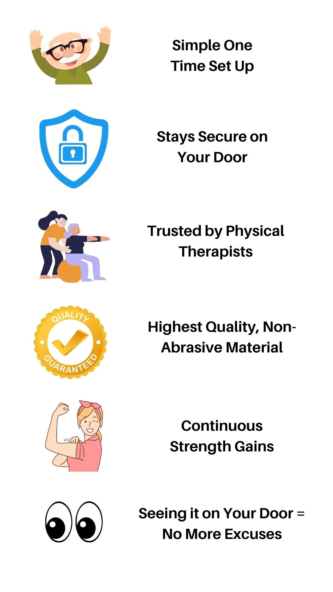 Attaching the handles to The DoorGym provides the perfect assistance for strengthening large muscle groups like your core, back, glutes, and quadriceps, while the bands have a resistance range of 2.5 - 40 lbs and are great for training smaller muscle groups like your chest, shoulders, rotator cuff and arms. Easily alternating between bodyweight and resistance band exercises makes The DoorGym is your all in one strength training solution.